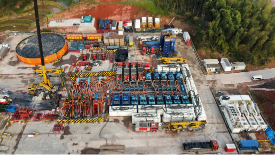 ❖近日,东方宏华下属宏华电气顺利完成渝西地区某平台电动压裂施工。该平台共部署6口井,平均井深6774米,平均垂深4300米,加砂强度3.9吨/米,单日最高压裂4段,创国内深层页岩气单平台深度最深、注入液量最多、注入支撑剂量最多3项新纪录。在平均施工压力110MPa工况下,宏华电气多措并举,顺利保障设备稳定、高效运行和项目顺利实施。